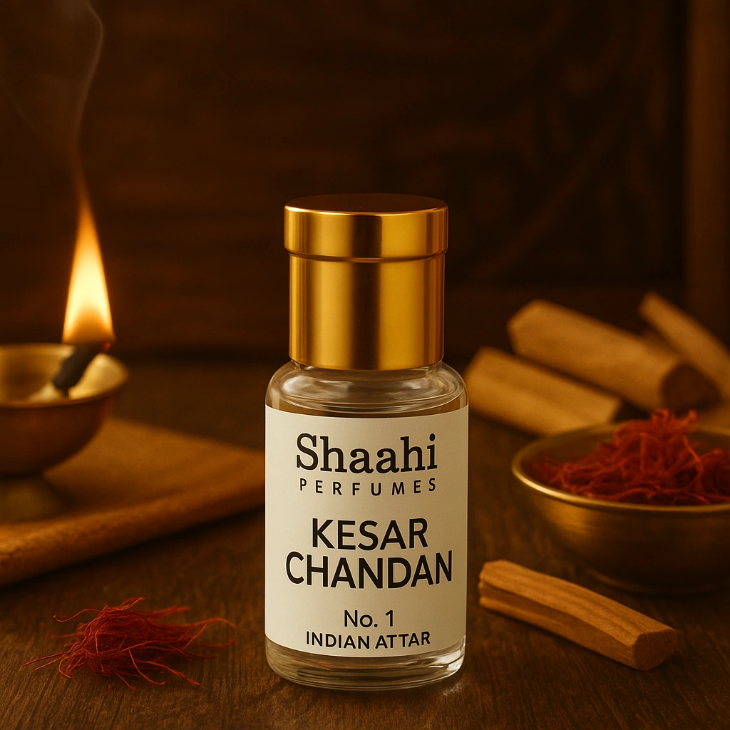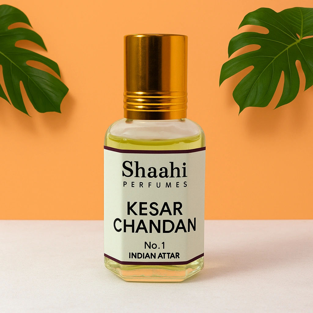 Kesar Chandan Attar, crafted in Kannauj, blends the rich warmth of pure saffron with the smooth, woody depth of sandalwood for a timeless aromatic experience. This alcohol-free, long-lasting attar is traditionally distilled to deliver a calming, luxurious fragrance perfect for daily wear and spiritual occasions.