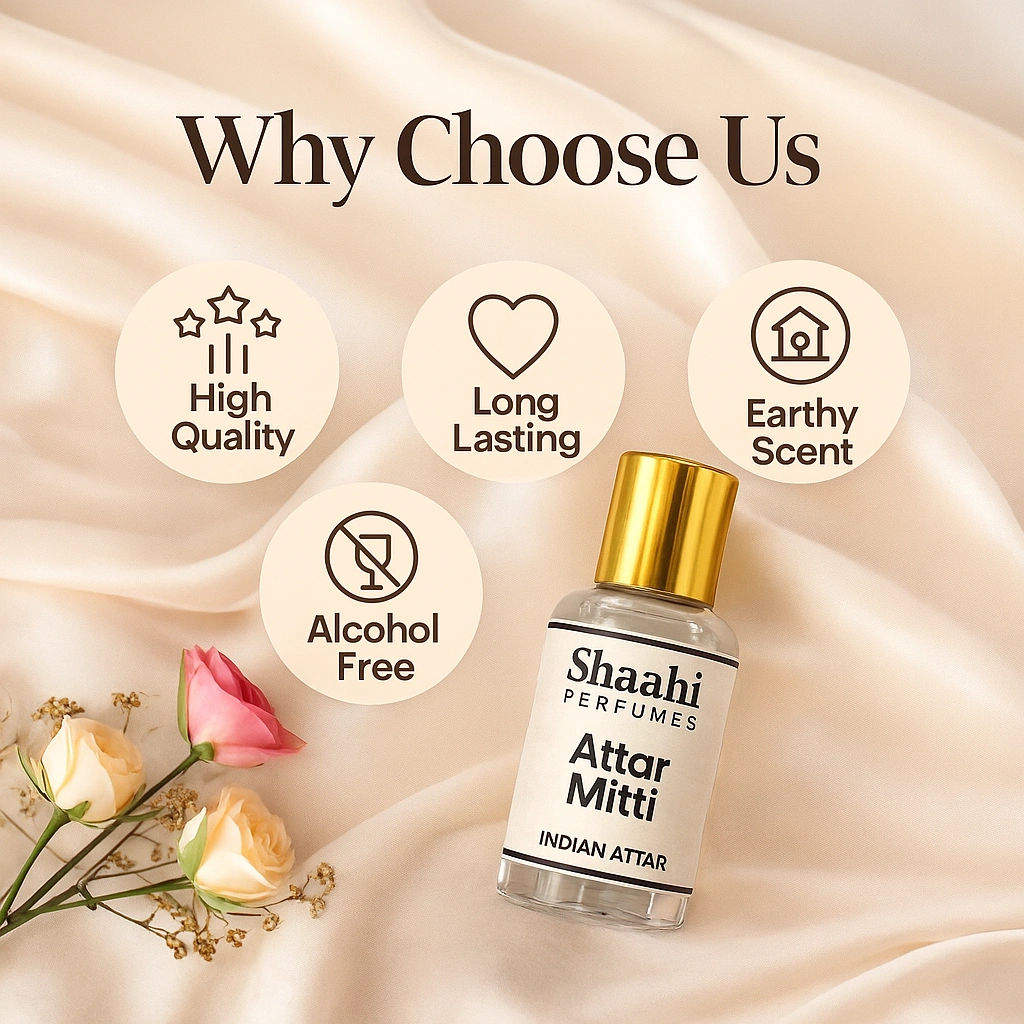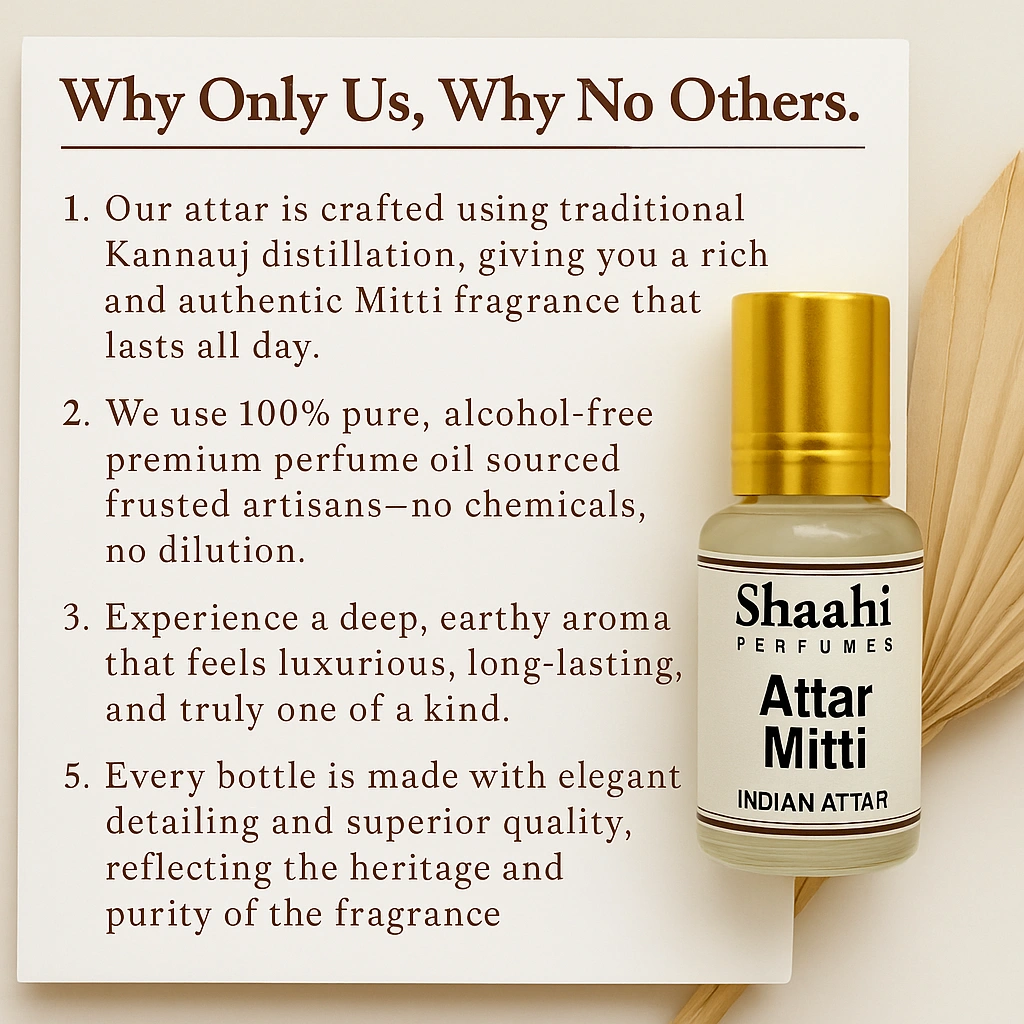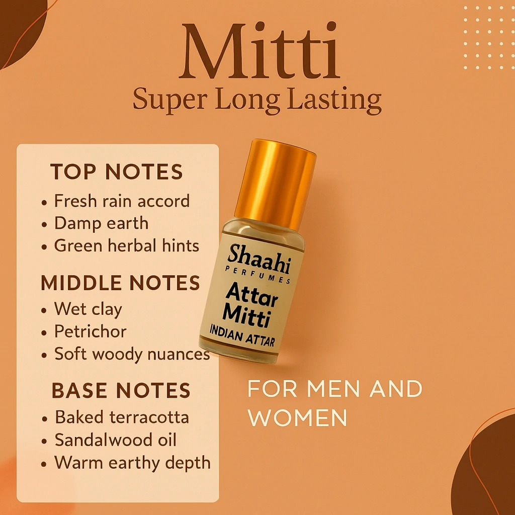 Mitti Attar, traditionally crafted in Kannauj, captures the nostalgic aroma of fresh earth after rainfall with soft, warm and natural undertones. This alcohol-free, long-lasting attar is distilled using age-old methods to deliver a soothing, earthy fragrance that reflects the true essence of nature.