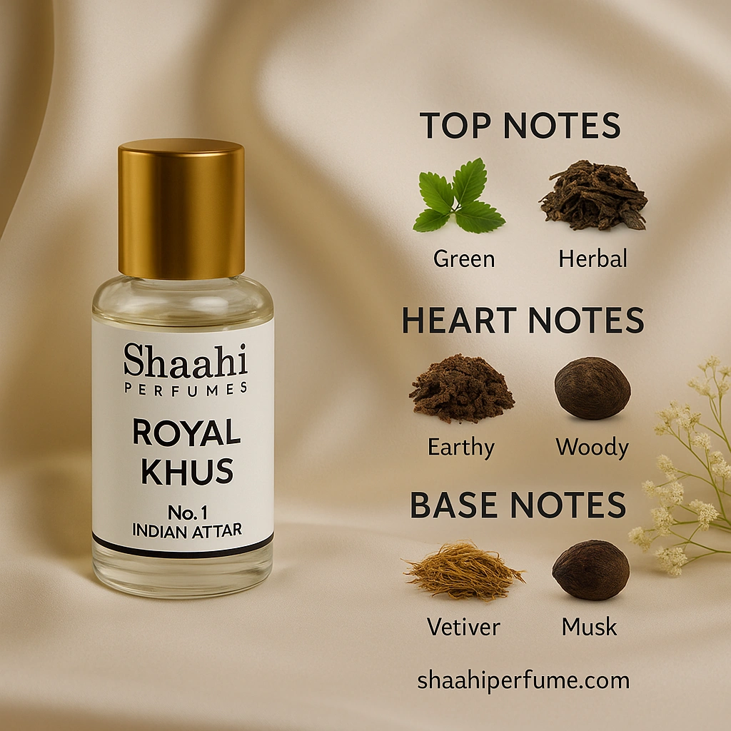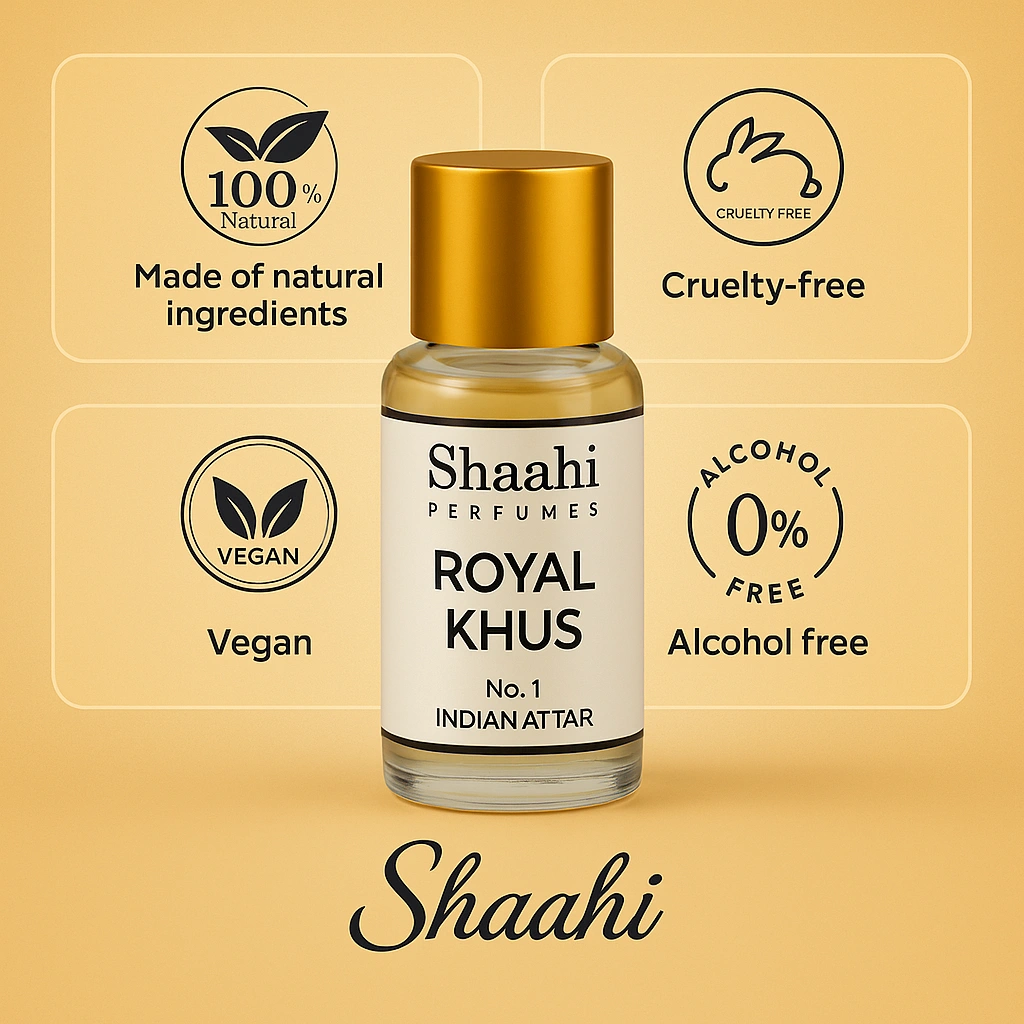 Royal Khus Attar, crafted in Kannauj, captures the cool, earthy freshness of pure vetiver roots with soft woody and slightly smoky undertones. This alcohol-free, long-lasting attar is traditionally distilled to deliver a refreshing and royal fragrance ideal for daily wear and warm climates.