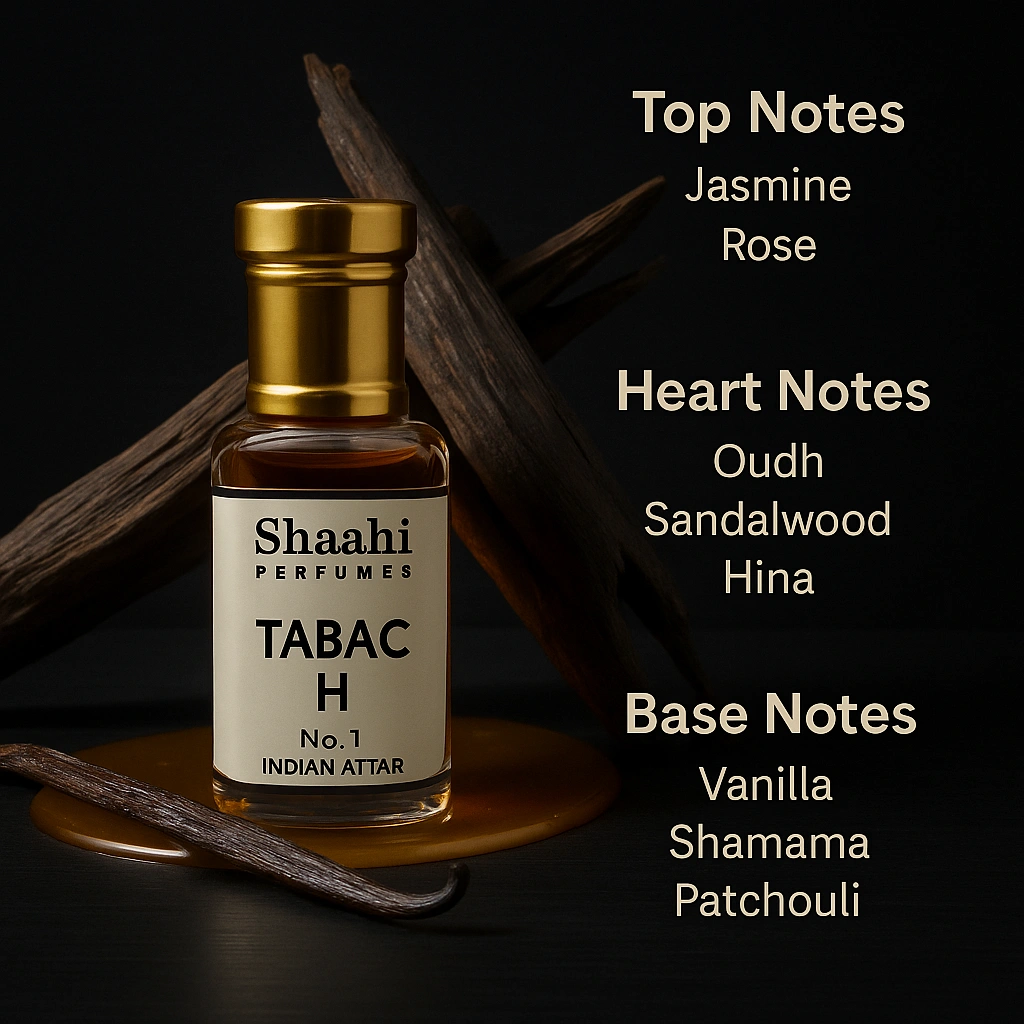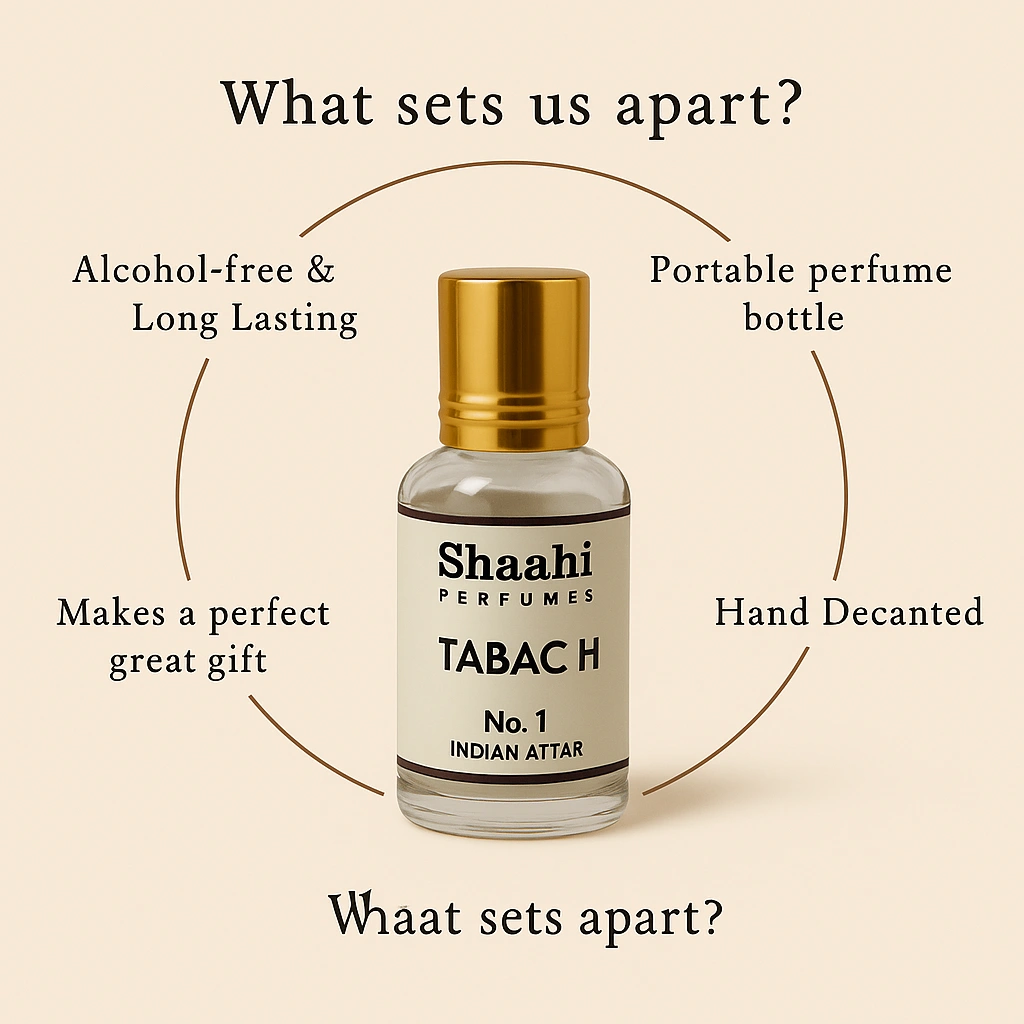 Tabach Attar, crafted in Kannauj, blends rich woody notes with warm spicy and slightly sweet undertones for a bold and distinctive fragrance profile. This alcohol-free, long-lasting attar is traditionally distilled to deliver a smooth, powerful scent ideal for evening wear and special occasions.