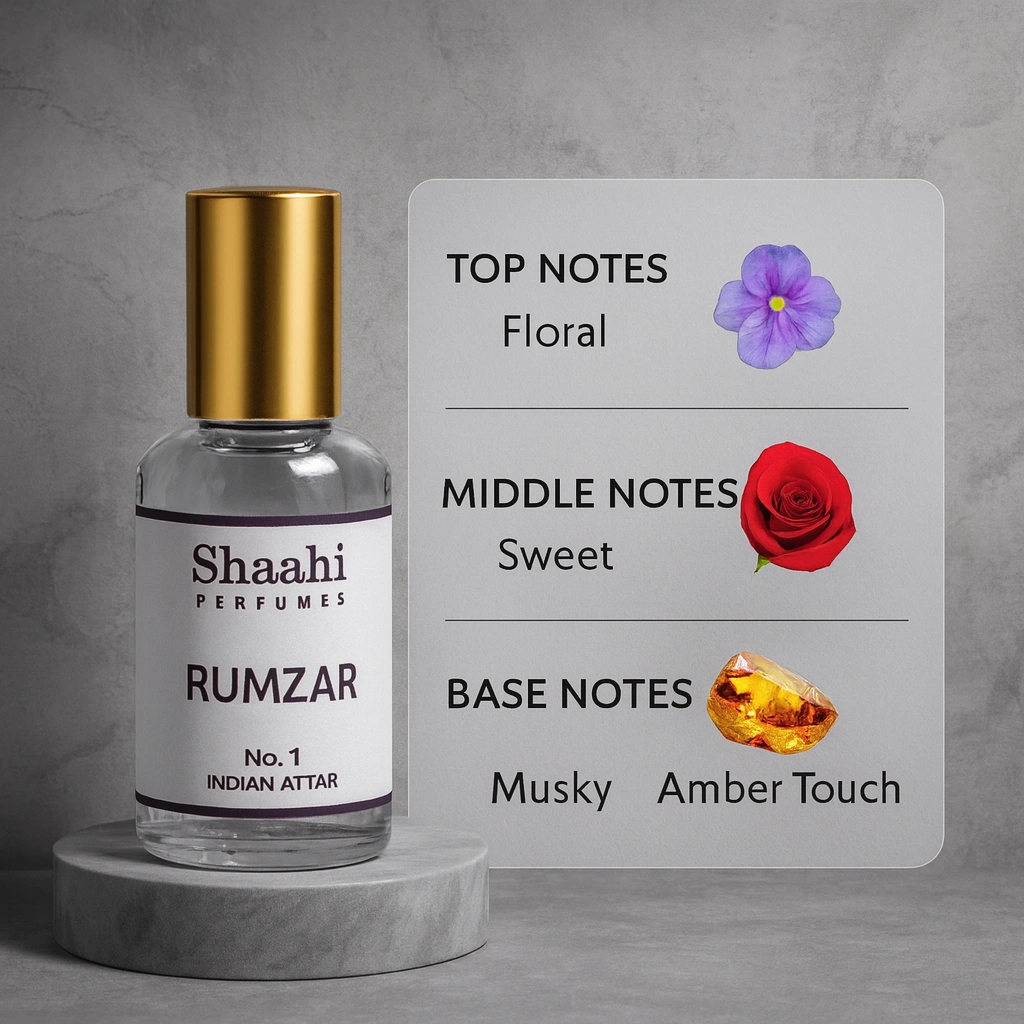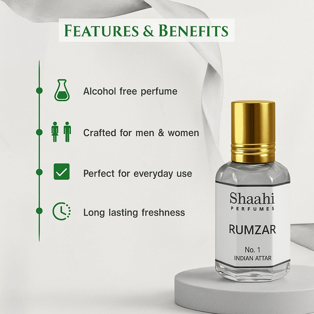 Rumzar Attar, crafted in Kannauj, blends warm spicy notes with soft woody and slightly sweet undertones for a bold and captivating fragrance profile. This alcohol-free, long-lasting attar is traditionally distilled to deliver a smooth, elegant scent ideal for daily wear and evening occasions.