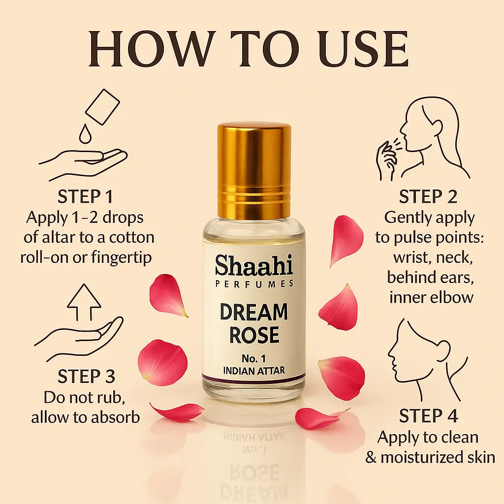 Dream Rose Attar, crafted in Kannauj, blends fresh blooming rose petals with soft floral and slightly sweet undertones for an elegant and soothing aroma. This alcohol-free, long-lasting attar is traditionally distilled to deliver a delicate yet captivating fragrance perfect for daily wear and special moments.